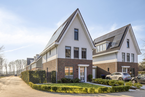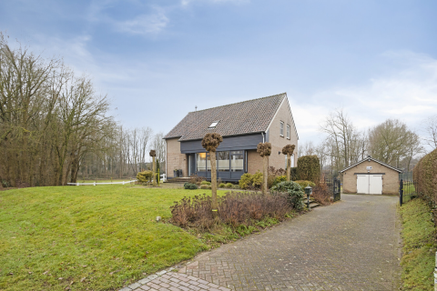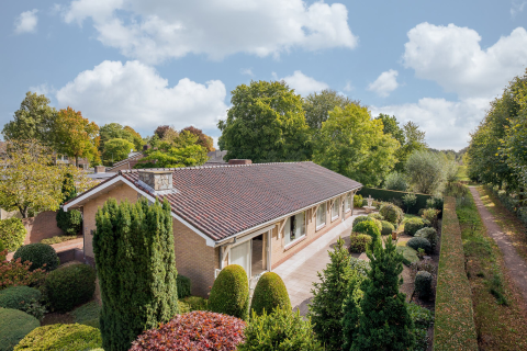 De oprit biedt plek voor meerdere auto's en leidt naar de ruime, verwarmde garage. De tuin is tevens bereikbaar via een toegangspoort aan de zijkant van de garage.